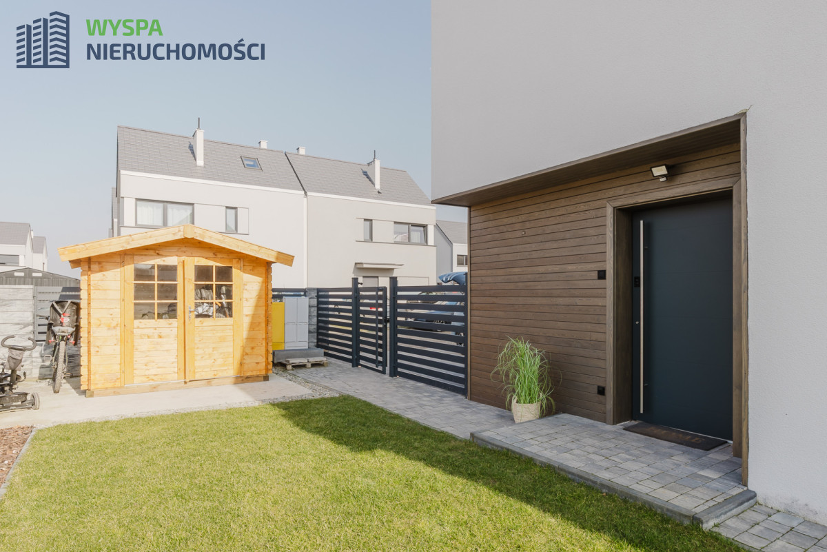 Działka 412m² z eleganckim tarasem i designerskimi meblami wypoczynkowymi, z wyznaczonym miejscem na grilla. Doinwestowany ogród, zagospodarowany licznymi roślinami, które nie są widoczne na obecnych zdjęciach.