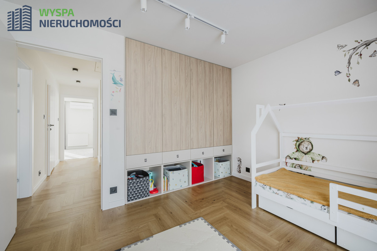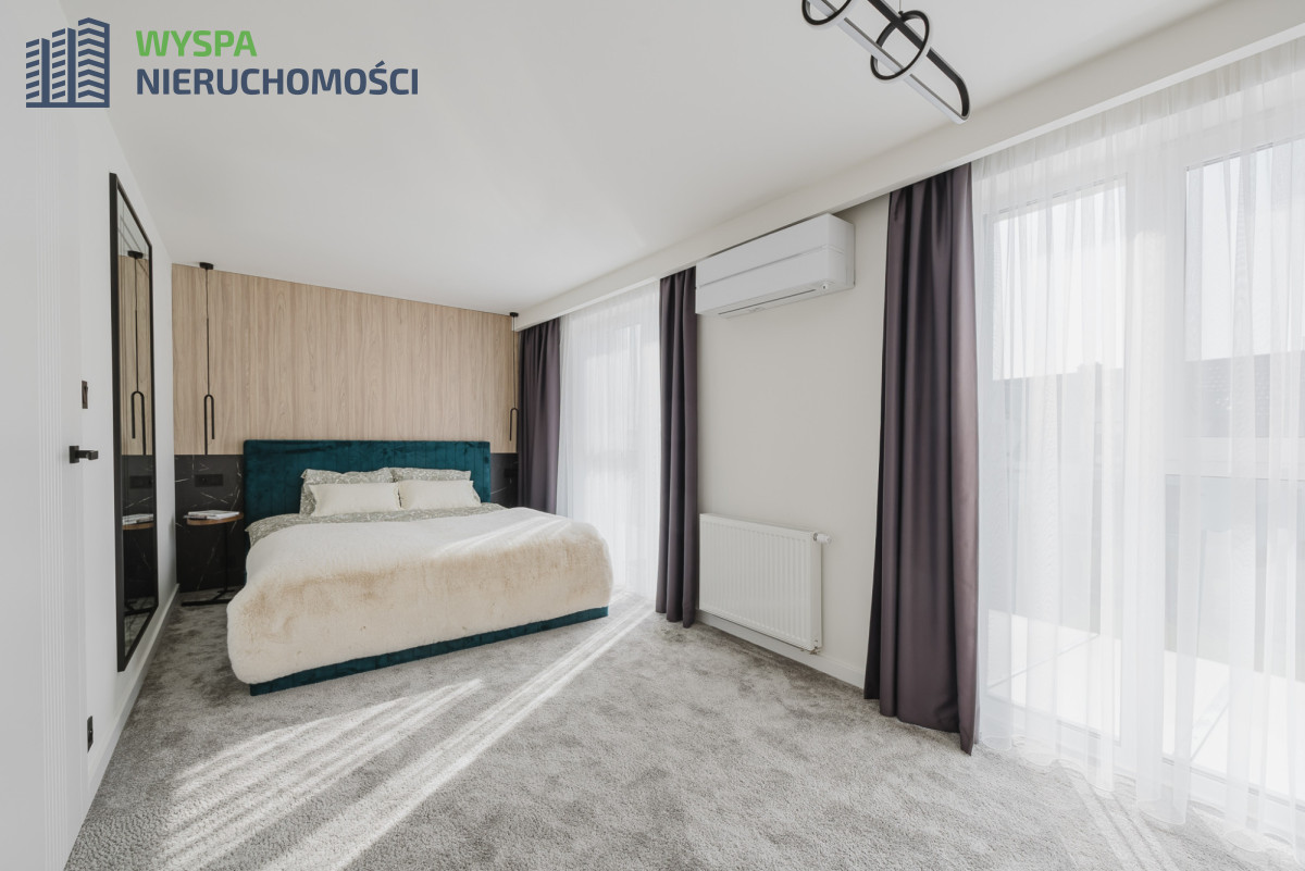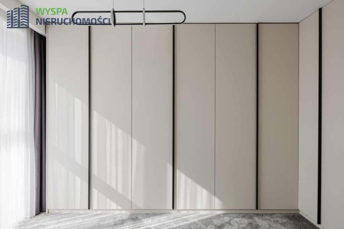 *Trzy sypialnie:* Jeden z pokoi przeznaczony dla gości. Drugi pokój dla dziecka z zabudową meblową i oknami do ziemi zapewnia doskonałe doświetlenie pomieszczeń. Sypialnia główna z garderobą i wygodnym, dużym łóżkiem otoczona jest grubą wykładziną, która dodaje wnętrzom przytulności. Białe drzwi najwyższej klasy idealnie komponują się z całą koncepcją wystroju, jednocześnie pozostając niemal niewidocznymi.