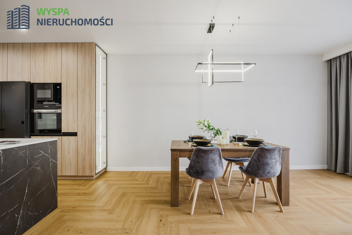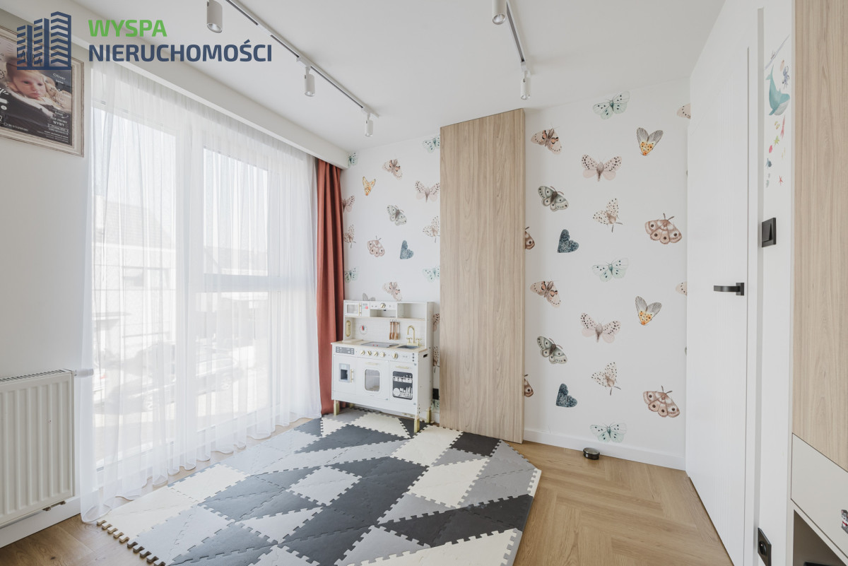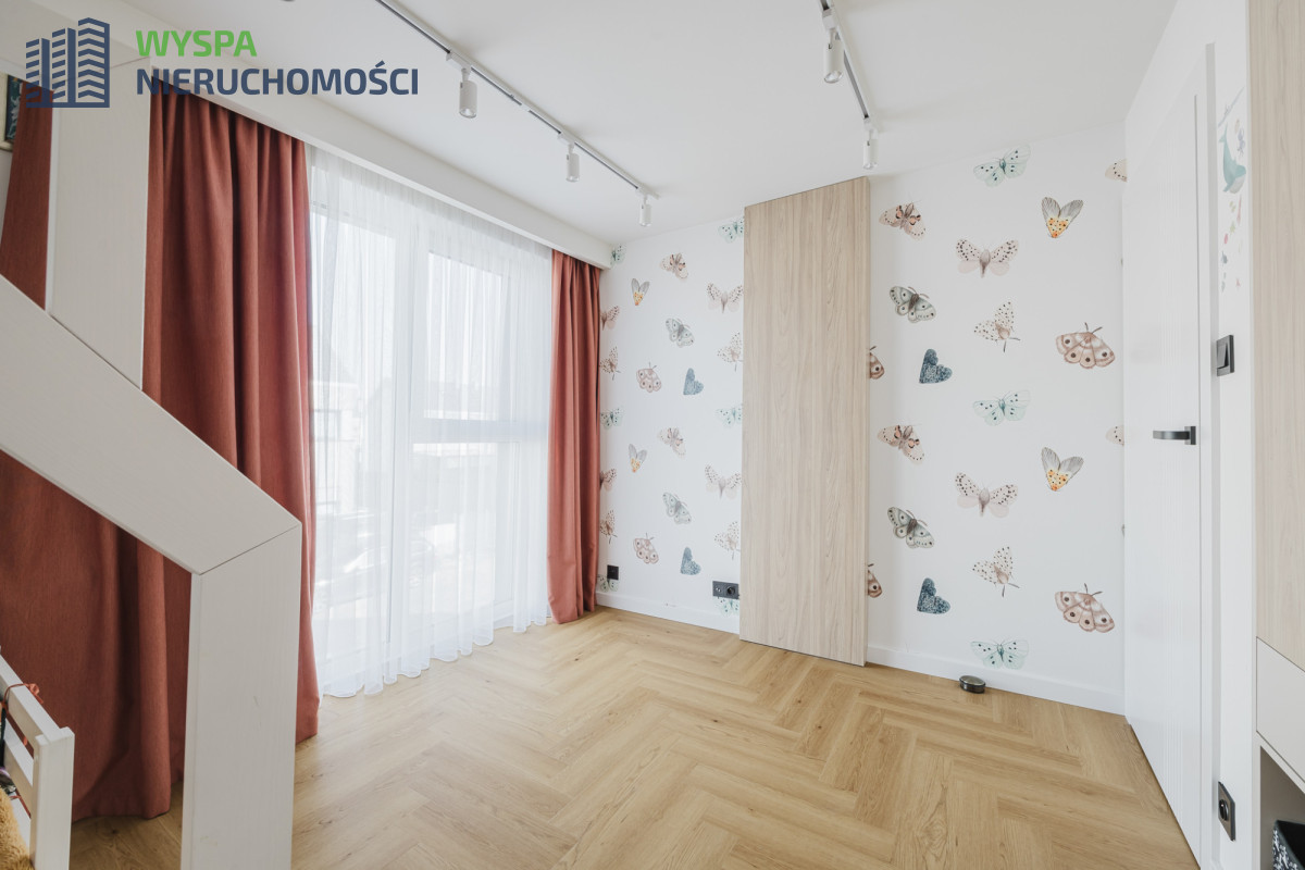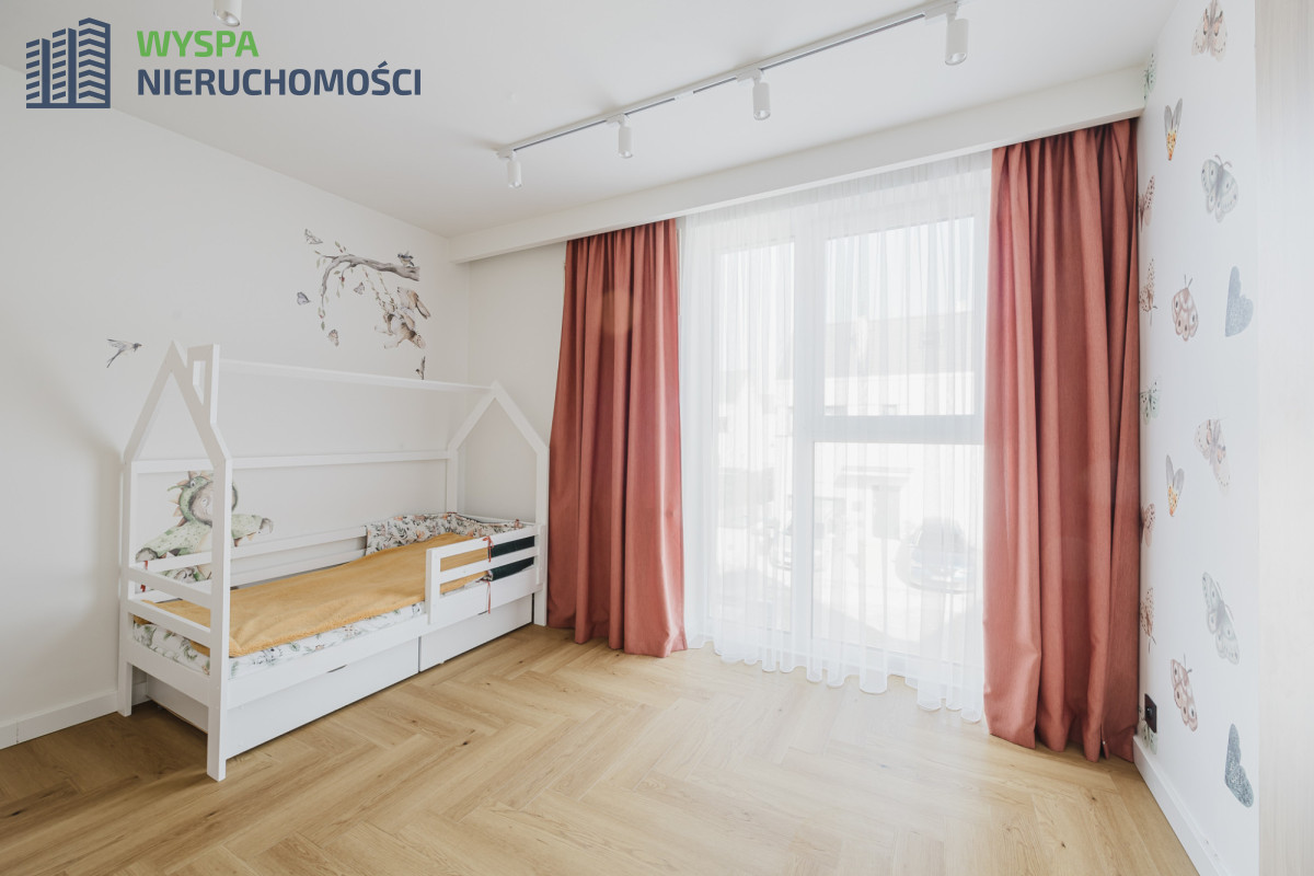 *Trzy sypialnie:* Jeden z pokoi przeznaczony dla gości. Drugi pokój dla dziecka z zabudową meblową i oknami do ziemi zapewnia doskonałe doświetlenie pomieszczeń. Sypialnia główna z garderobą i wygodnym, dużym łóżkiem otoczona jest grubą wykładziną, która dodaje wnętrzom przytulności. Białe drzwi najwyższej klasy idealnie komponują się z całą koncepcją wystroju, jednocześnie pozostając niemal niewidocznymi.