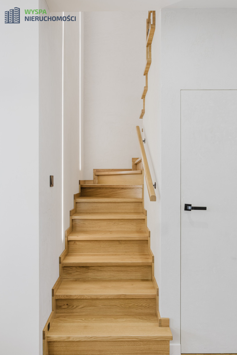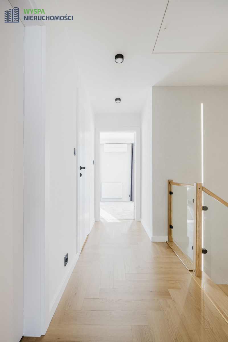 *Luksusowe wykończenie:* Mieszanka nowoczesnych lamp, naturalnych materiałów oraz przestronnych wnętrz sprawia, że dom jest nie tylko funkcjonalny, ale i estetyczny. Ogrzewanie podłogowe zapewnia komfort w chłodne dni. Na korytarzu zastosowano nowoczesne, ledowe oświetlenie. W całym domu znajdziemy subtelne, ale starannie przemyślane akcenty. Na dole wejście do strefy dziennej oddzielają wyjątkowe przeszklone drzwi.