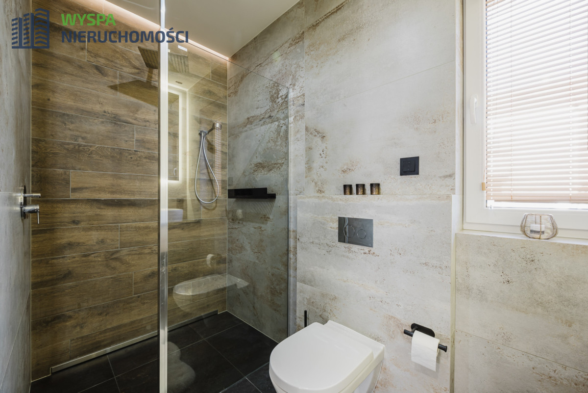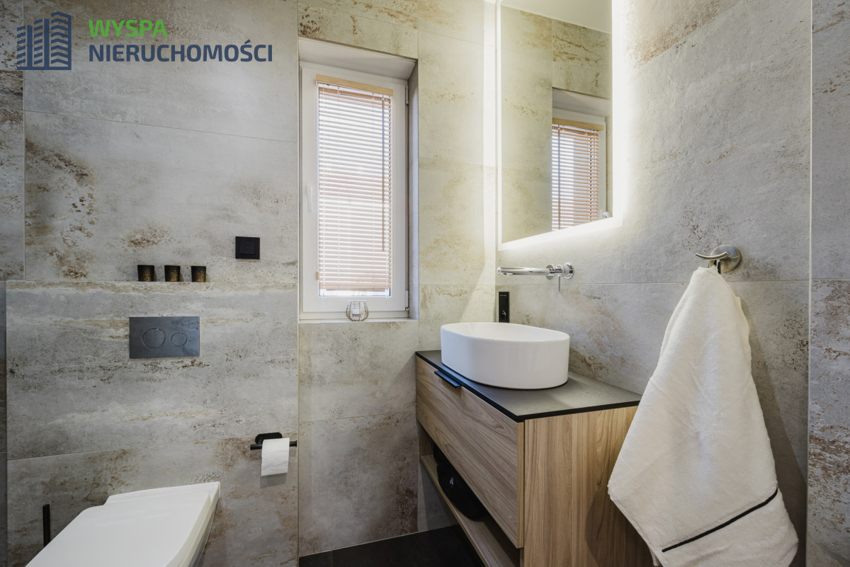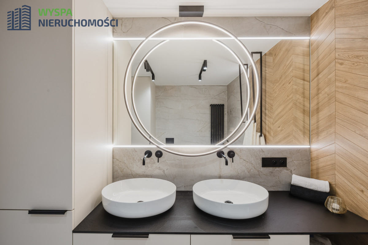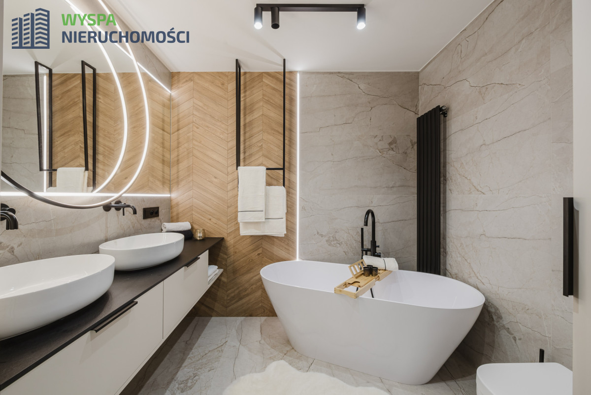 *Łazienki:* Pokój kąpielowy został zaprojektowany według najnowszej mody. Dekoracyjne lustro z światłem LED wspaniale oświetla pomieszczenie, duża wanna kąpielowa, pojemne szafki wiszące na wymiar z dwoma umywalkami oraz zabudowa kryje w sobie sprzęty AGD z najwyższej klasy (pralko-suszarkę). Armatura łazienkowa, klamki, szafy bez uchwytów oraz dobrane lampy - wprowadzają elegancję, nie dominując nad przestrzenią.