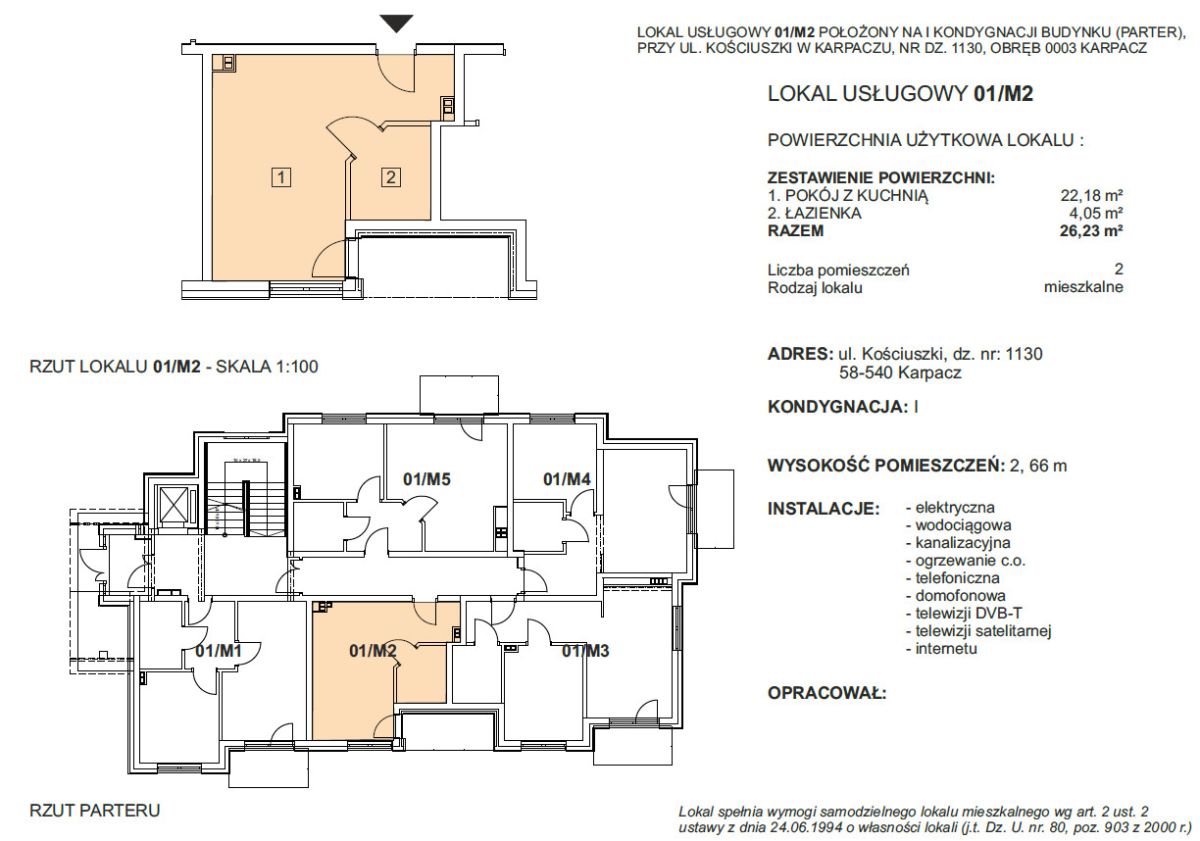 Przedmiotem sprzedaży jest kawalerka usytuowana na parterze 4-ro kondygnacyjnego apartamentowca położonego w Karpaczu.