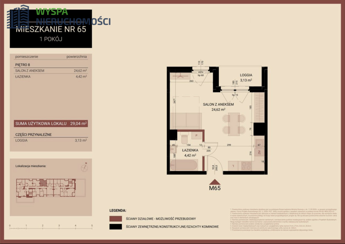 Przemyślany układ obejmuje nieruchomość o powierzchni 29,04 m2 składa się z: