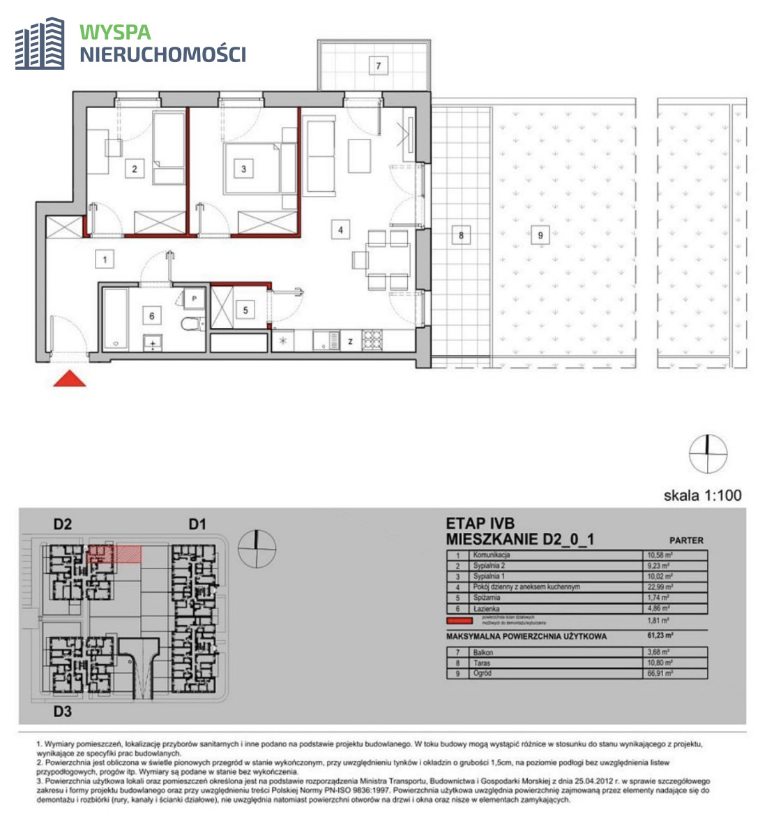 - metraż 61,23 m2 salon z aneksem + 2 pokoje