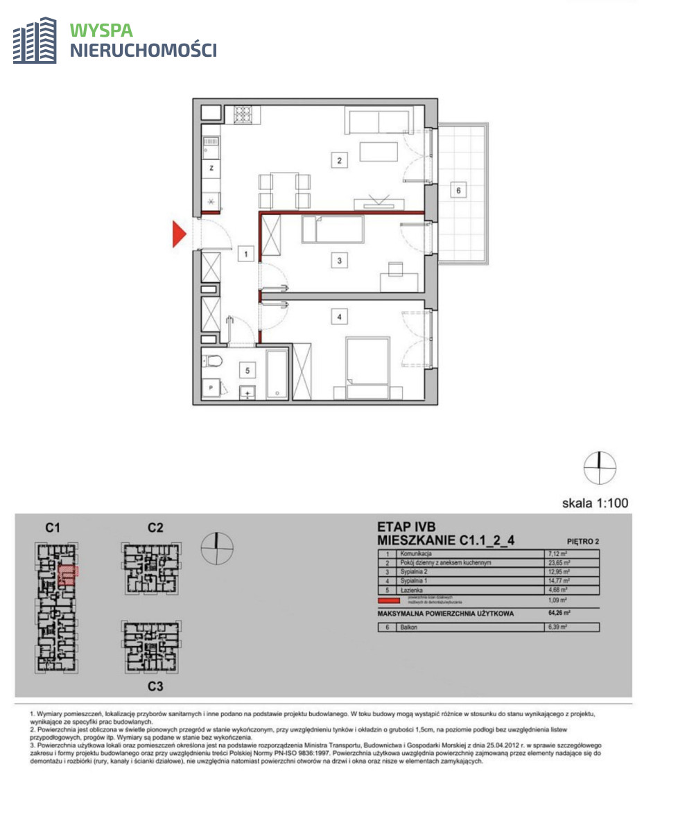 - metraż 64,26 m2 salon z aneksem + 2 pokoje