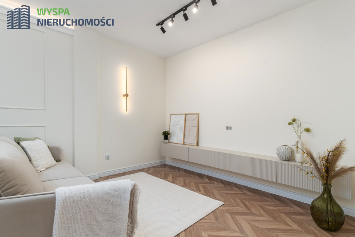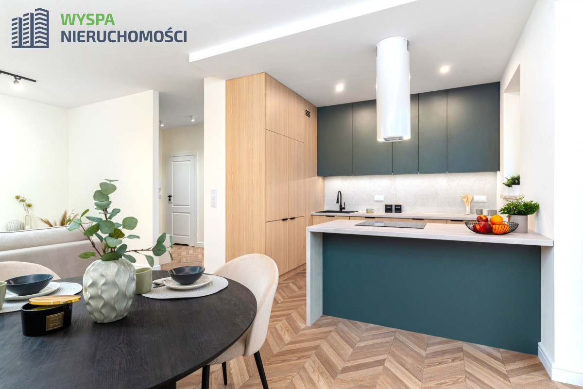 Mieszkanie składa się z dwóch jasnych i przestronnych pokoi. Duża kuchnia, wyposażona w meble wykonane na wymiar przez stolarza, stanowi serce tego lokum, oferując mnóstwo miejsca do gotowania i przechowywania. Nowoczesna zabudowa kuchenna zachwyca funkcjonalnością i estetyką.