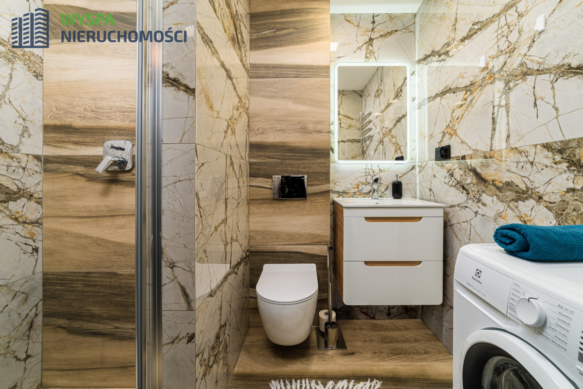 - łazienki z toaletą, kabiną prysznicową, umywalką i pralką oraz szafką umywalkową i podświetlanym lustrem,