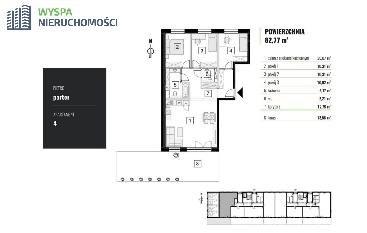 - metraż 82,77 m2 salon z aneksem + 3 pokoje