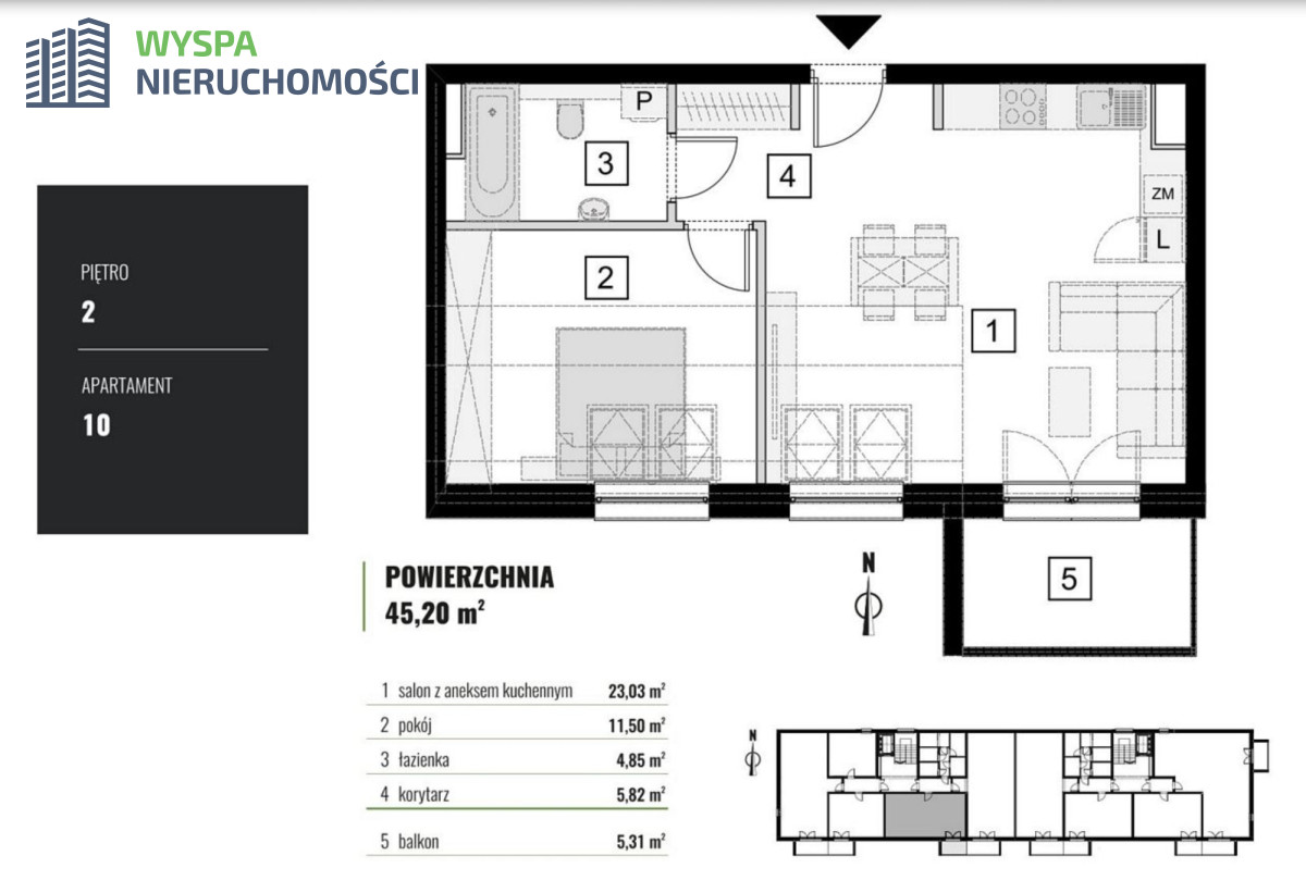 - metraż 45,20 m2 salon z aneksem + 1 pokój