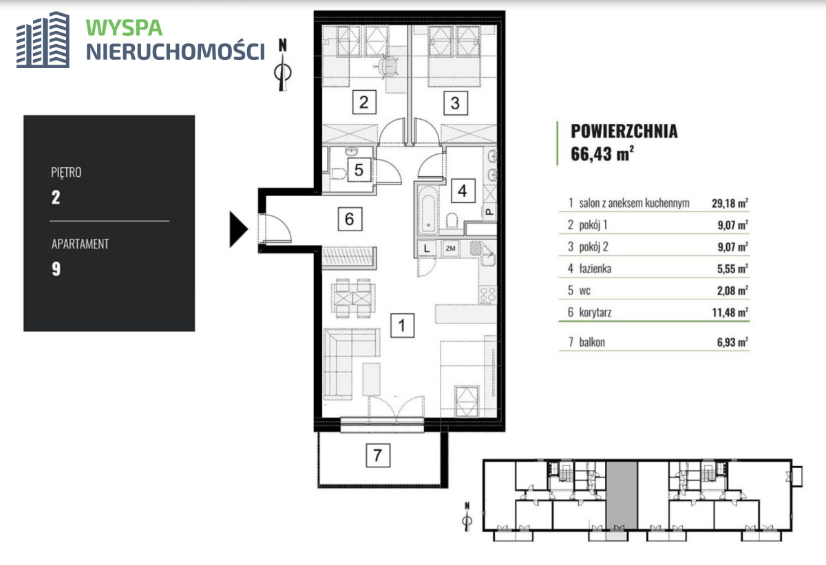 - metraż 66,43 m2 salon z aneksem + 2 pokoje