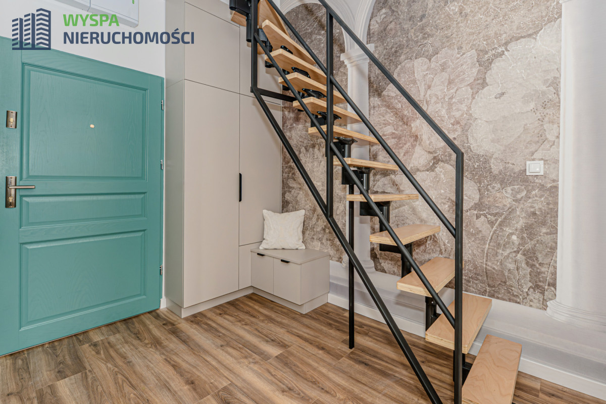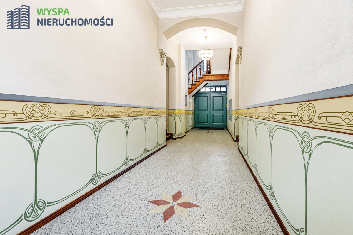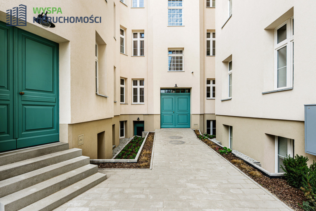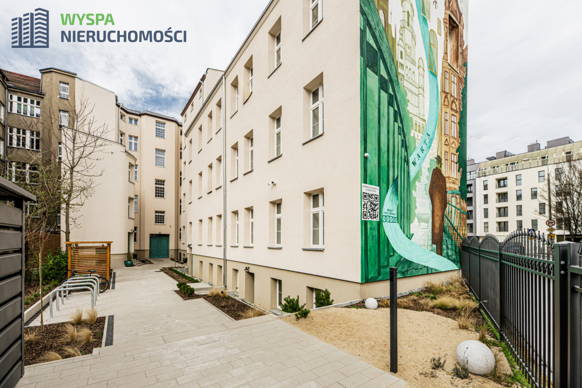 BUDYNEKKamienica po rewitalizacji ozdobiona efektownym muralem, piękna, zadbana klatka schodowa z oryginalnymi gzymsami i rzeźbami, odnowione drewniane schody, klimatyczny dziedziniec z ławeczkami i roślinnością, gdzie można odpocząć po ciężkim dniu pracy.