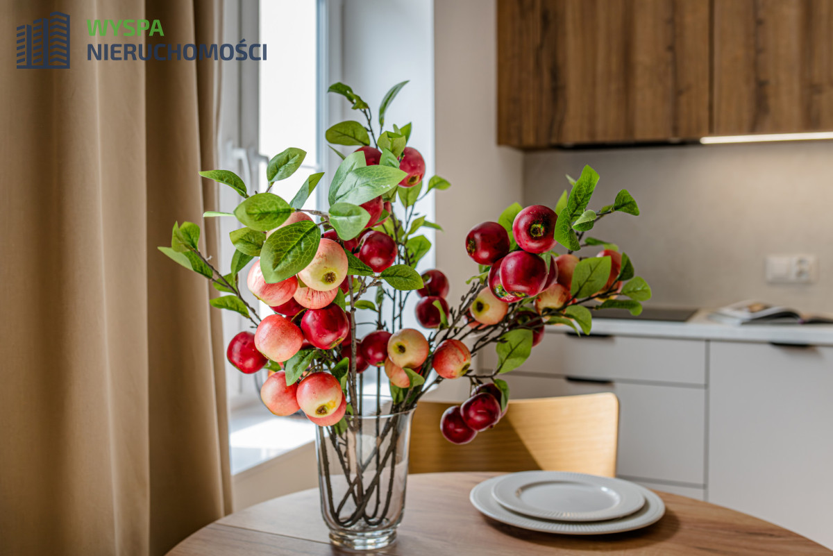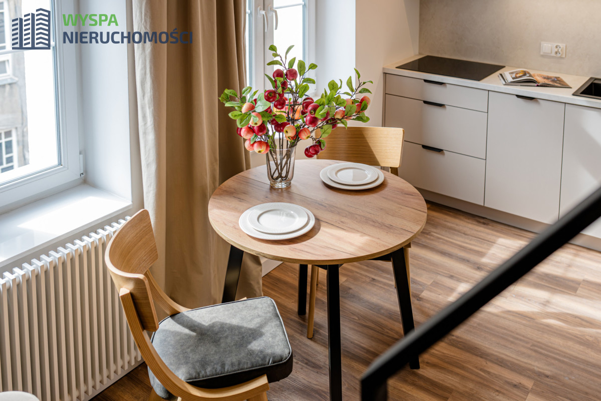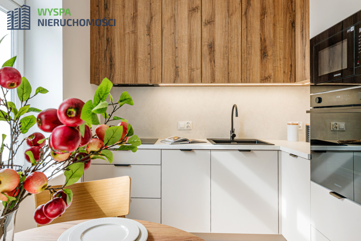 WYPOSAŻENIE- pokój z aneksem kuchennym: zabudowa kuchenna: szafki dolne, górne do sufitu, podświetlone, ze sprzętem AGD: piekarnik, okap, kuchenka mikrofalowa, płyta indukcyjna, okrągły stół, krzesła, fotel. Zamontowano klimatyzację, która podnosi komfort życia, zapewnia odpowiednie warunki do pracy, wypoczynku i snu.