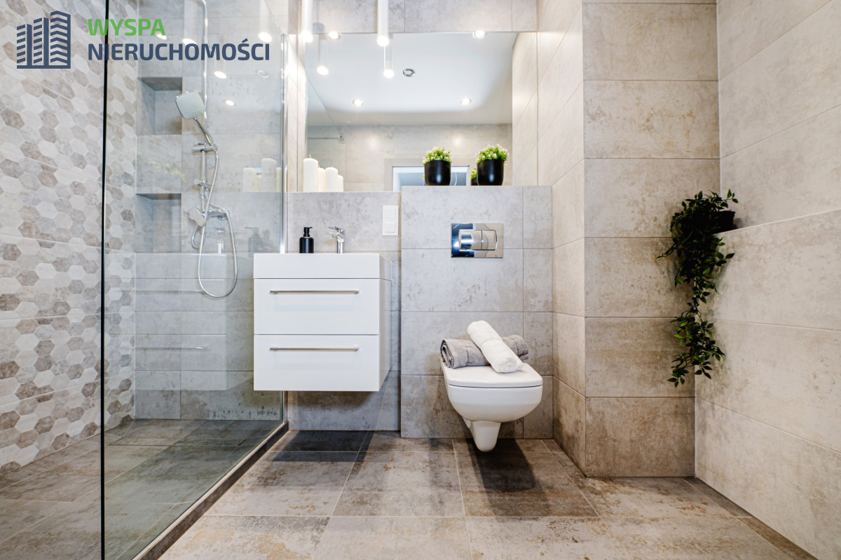 W łazience: prysznic, WC geberit, umywalka osadzona na szafce
