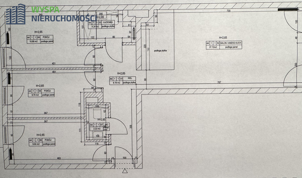 - salon z aneksem kuchennym - 27,72 m2 - z wyjściem na balkon