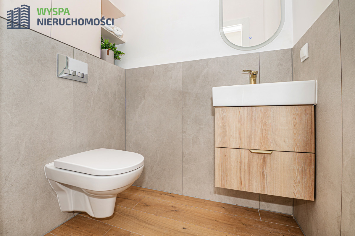 W toalecie: WC geberit z zabudową wykonaną na wymiar przez stolarza, umywalka osadzona na szafce, lustro z podświetleniem