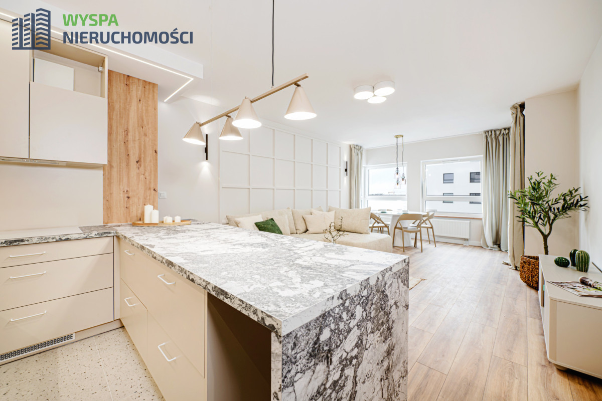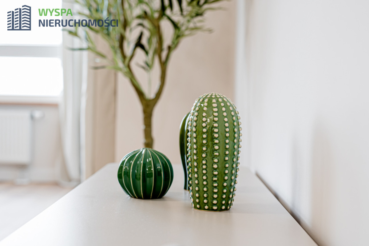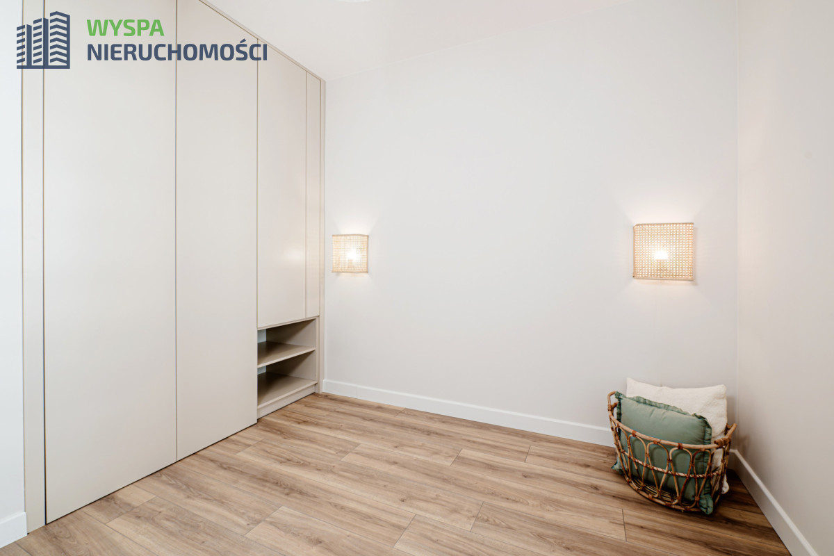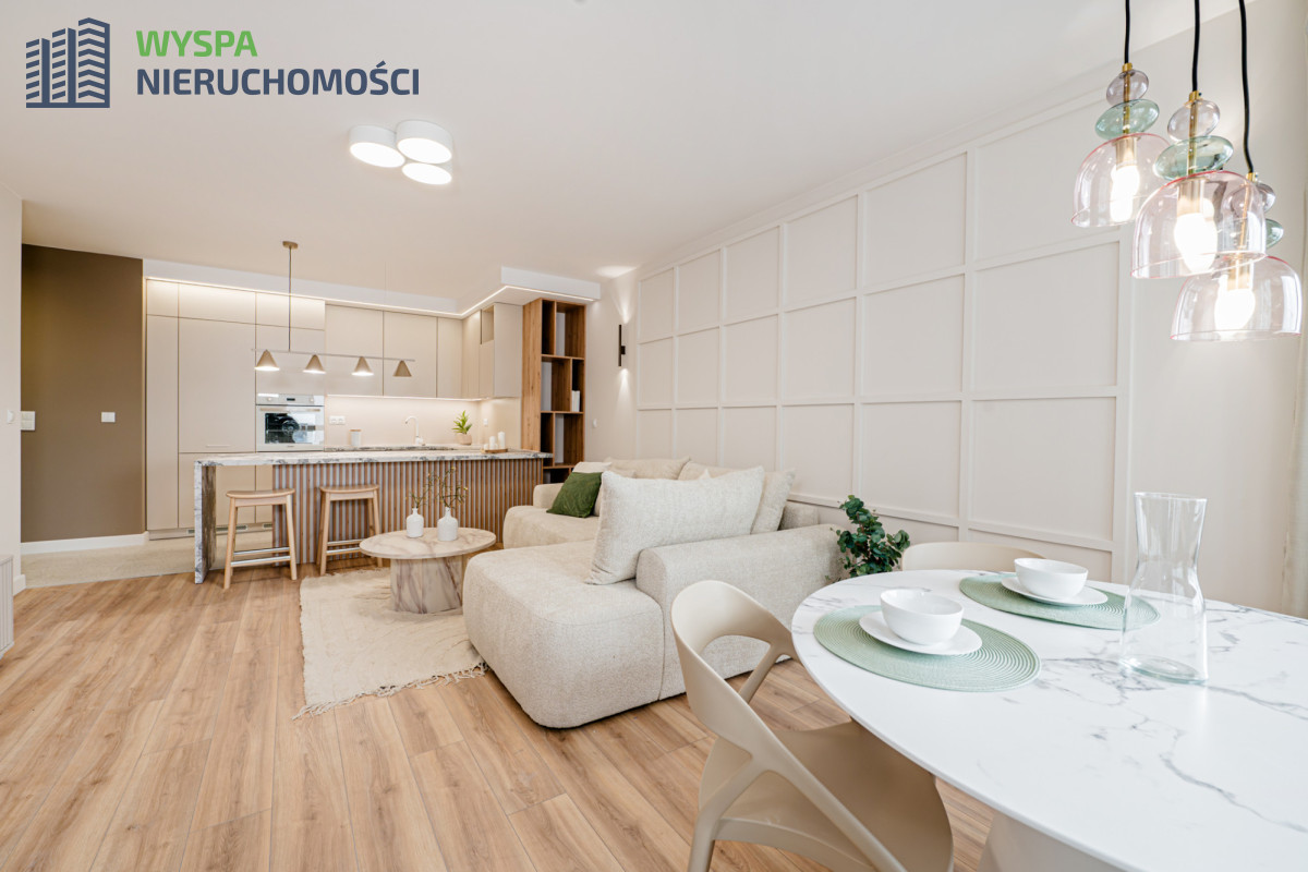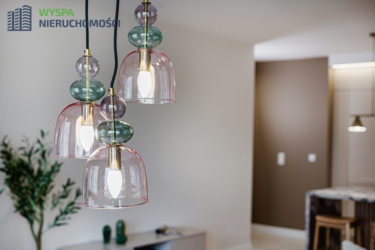 Mieszkanie wykończone w wysokim standardzie, zgodnie z najnowszymi trendami, zaprojektowane przez projektanta wnętrz. Do wykończenia mieszkania wykorzystano wysokiej jakości materiały. W pokoju dziennym: wygodna nowoczesna kanapa narożna, szafka RTV, elegancki stół i cztery krzesła. W aneksie kuchennym: zabudowa kuchenna: szafki górne podświetlane, dolne ze sprzętem AGD: piekarnik, lodówka z zamrażarką, zmywarka, płyta indukcyjna, okap podłączony do komina, wbudowany w szafkę. W korytarzu: podwójna szafa wykonana na wymiar przez stolarza.
