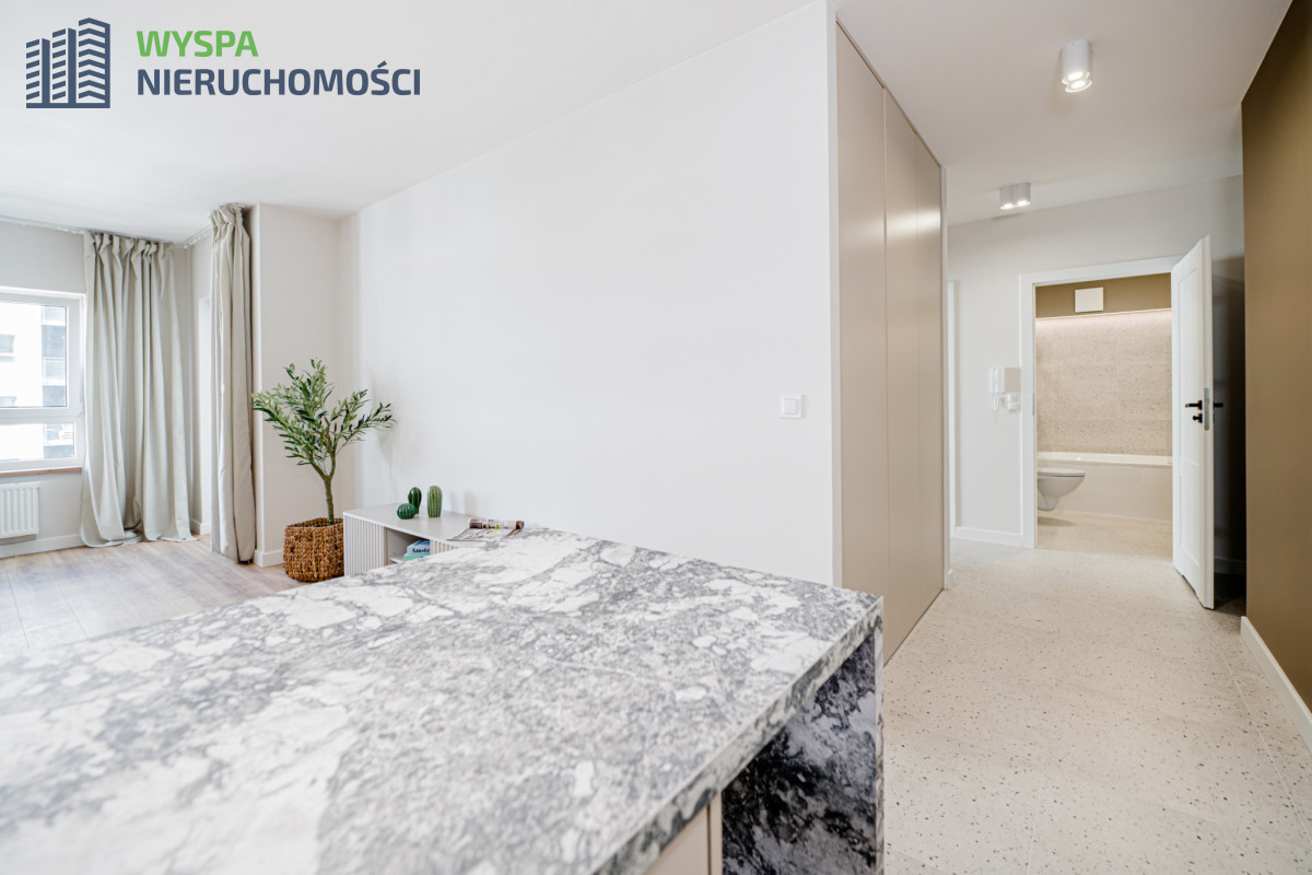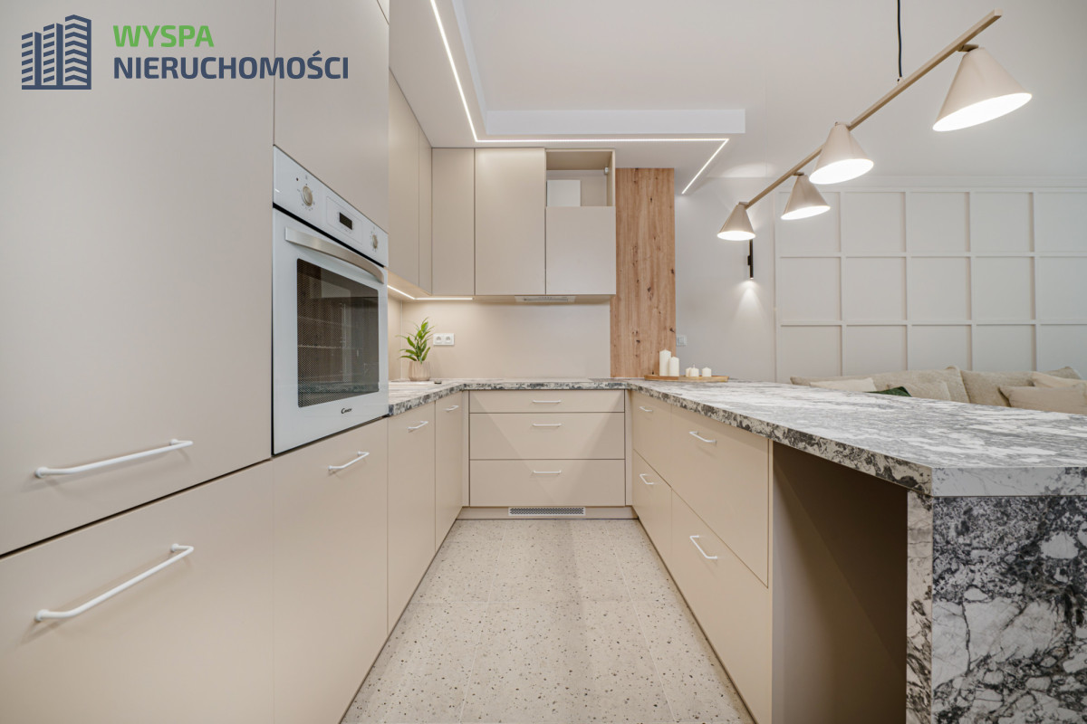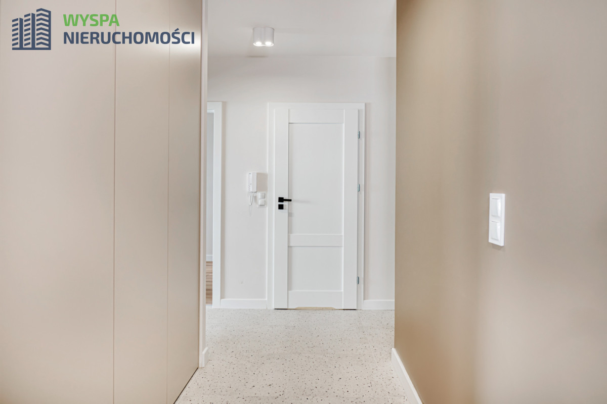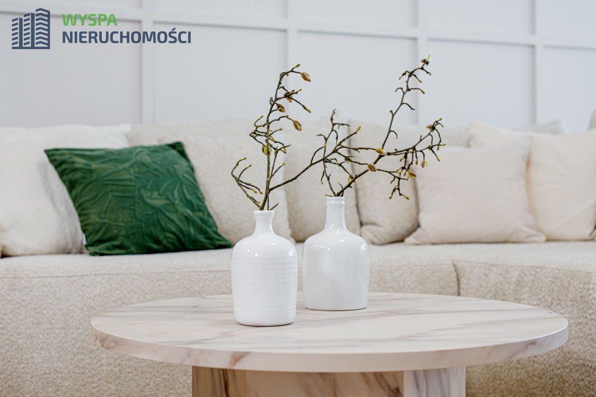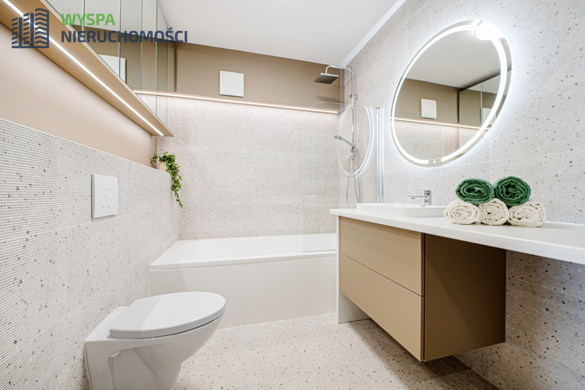 Mieszkanie wykończone w wysokim standardzie, zgodnie z najnowszymi trendami, zaprojektowane przez projektanta wnętrz. Do wykończenia mieszkania wykorzystano wysokiej jakości materiały. W pokoju dziennym: wygodna nowoczesna kanapa narożna, szafka RTV, elegancki stół i cztery krzesła. W aneksie kuchennym: zabudowa kuchenna: szafki górne podświetlane, dolne ze sprzętem AGD: piekarnik, lodówka z zamrażarką, zmywarka, płyta indukcyjna, okap podłączony do komina, wbudowany w szafkę. W korytarzu: podwójna szafa wykonana na wymiar przez stolarza.
