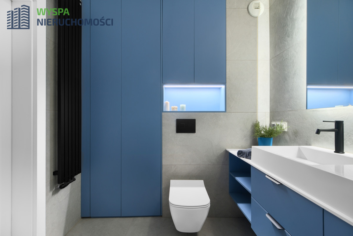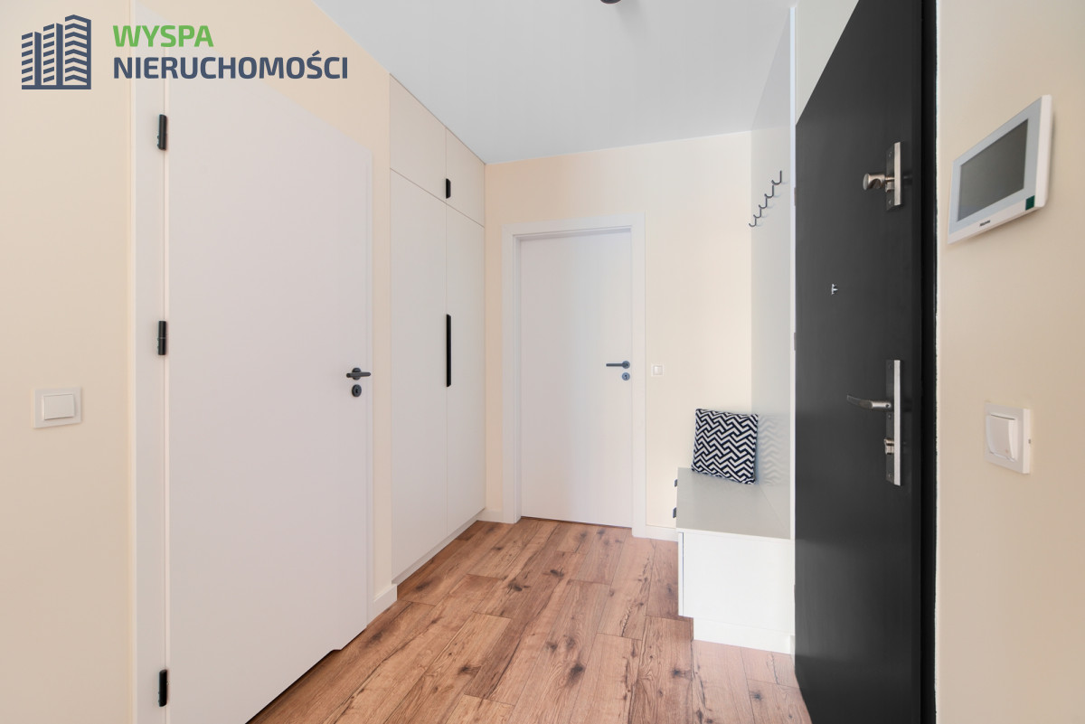 w aneksie kuchennym: zabudowa kuchenna: szafki górne z podświetleniem i dolne, dodatkowo wyspa z dodatkowym blatem roboczym i szufladami, oddzielająca część kuchenną od części wypoczynkowej. Zamontowano sprzęt AGD: piekarnik, płyta indukcyjna, kuchenka mikrofalowa, okap, w korytarzu: szafa wykonana na wymiar przez stolarza.