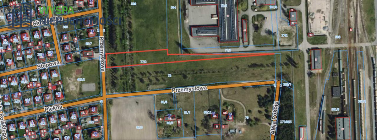 Nr ewidencyjnym działki 77/2, powierzchnia 5055 m2, szerokość frontu działki od strony jezdni 28 m,