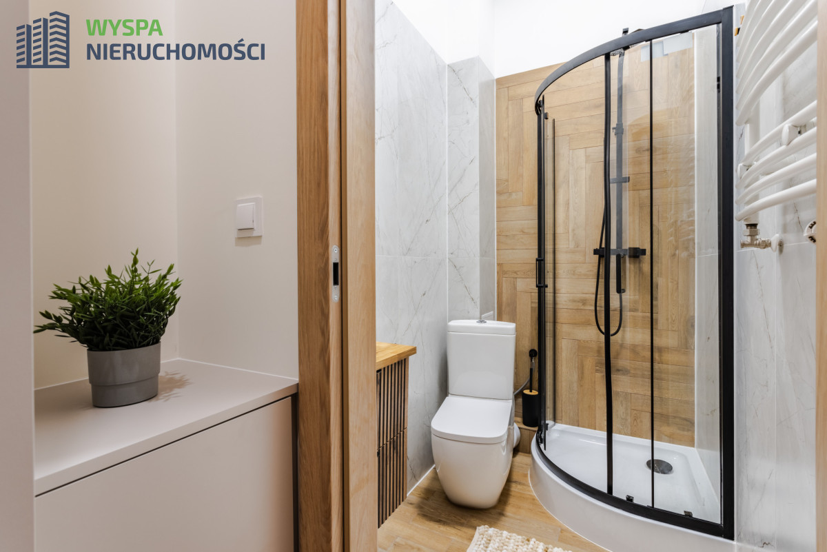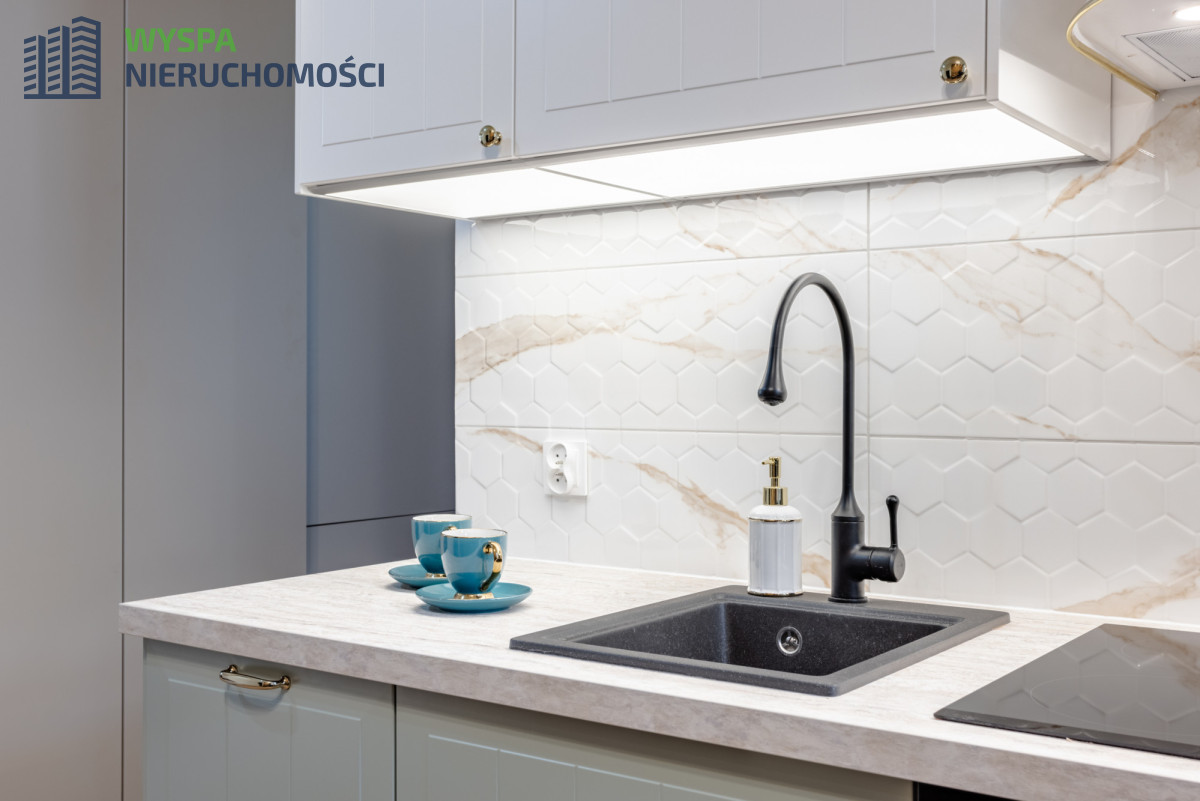 Mieszkanie całkowicie wyposażone, do wprowadzenia od zaraz, bez ponoszenia dodatkowych kosztów. W aneksie kuchennym: zabudowa kuchenna: szafki górne, dolne, ze sprzętem AGD: płyta indukcyjna, piekarnik, zmywarka, lodówka, okap, w części dziennej: efektowna welurowa sofa, okrągły stół z czterema krzesłami. W korytarzu: szafa wykonana na wymiar przez stolarza, co powoduje maksymalne wykorzystanie przestrzeni mieszkania, w zabudowie pralko-suszarka. W łazience: prysznic, umywalka wkomponowana w szafkę z szufladami, toaleta.