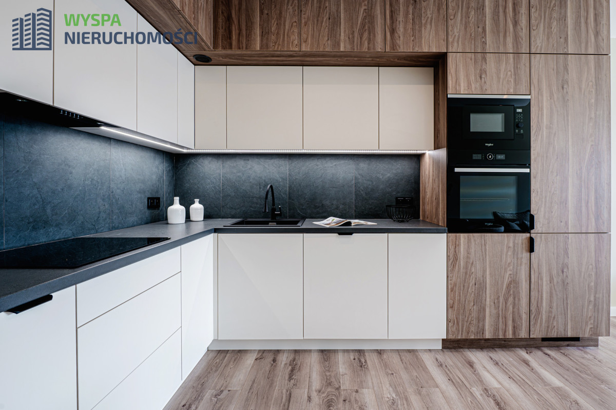 W zabudowie sprzęt AGD: płyta indukcyjna, piekarnik, okap, przygotowano miejsce do zamontowania zmywarki i lodówki.