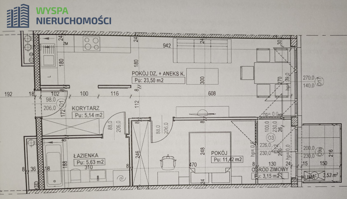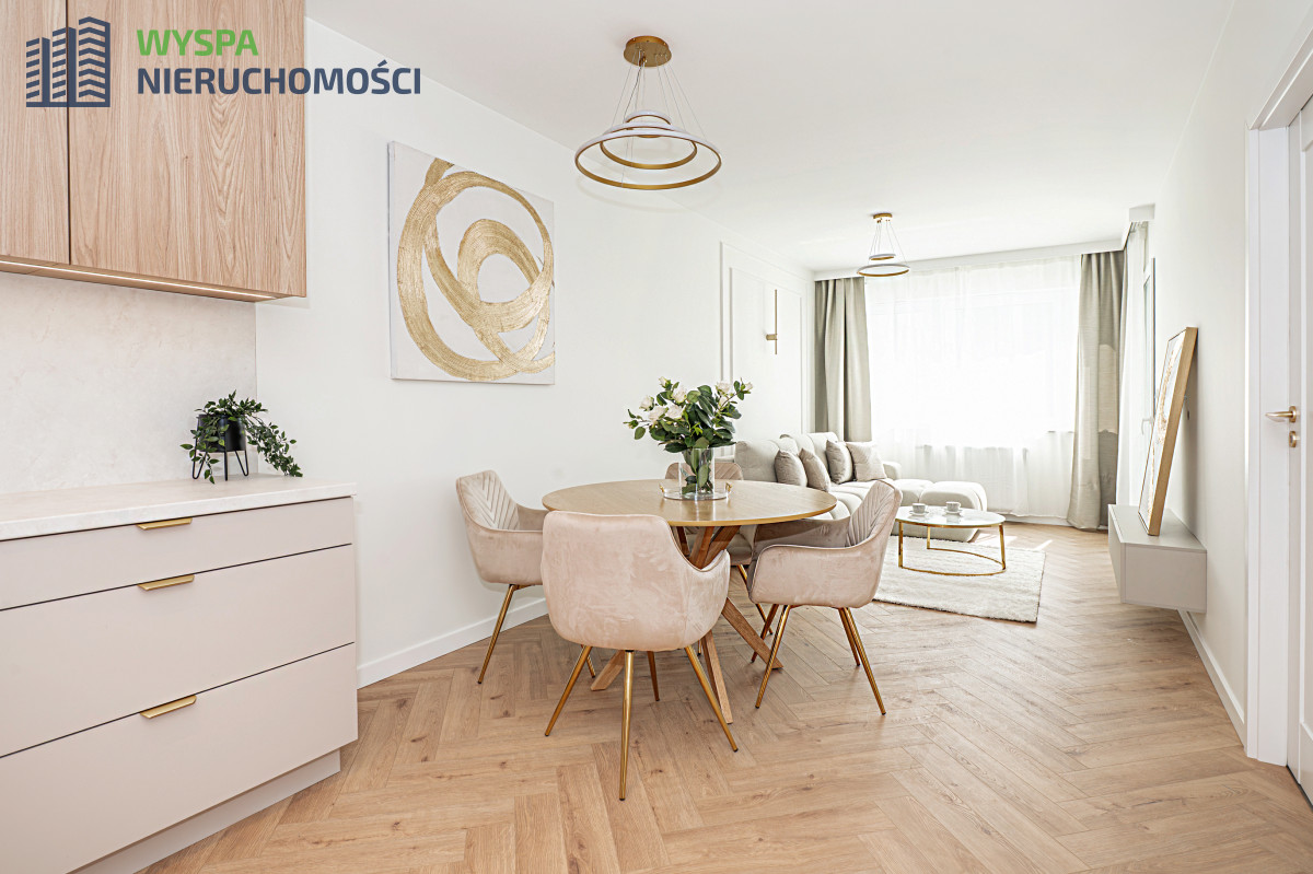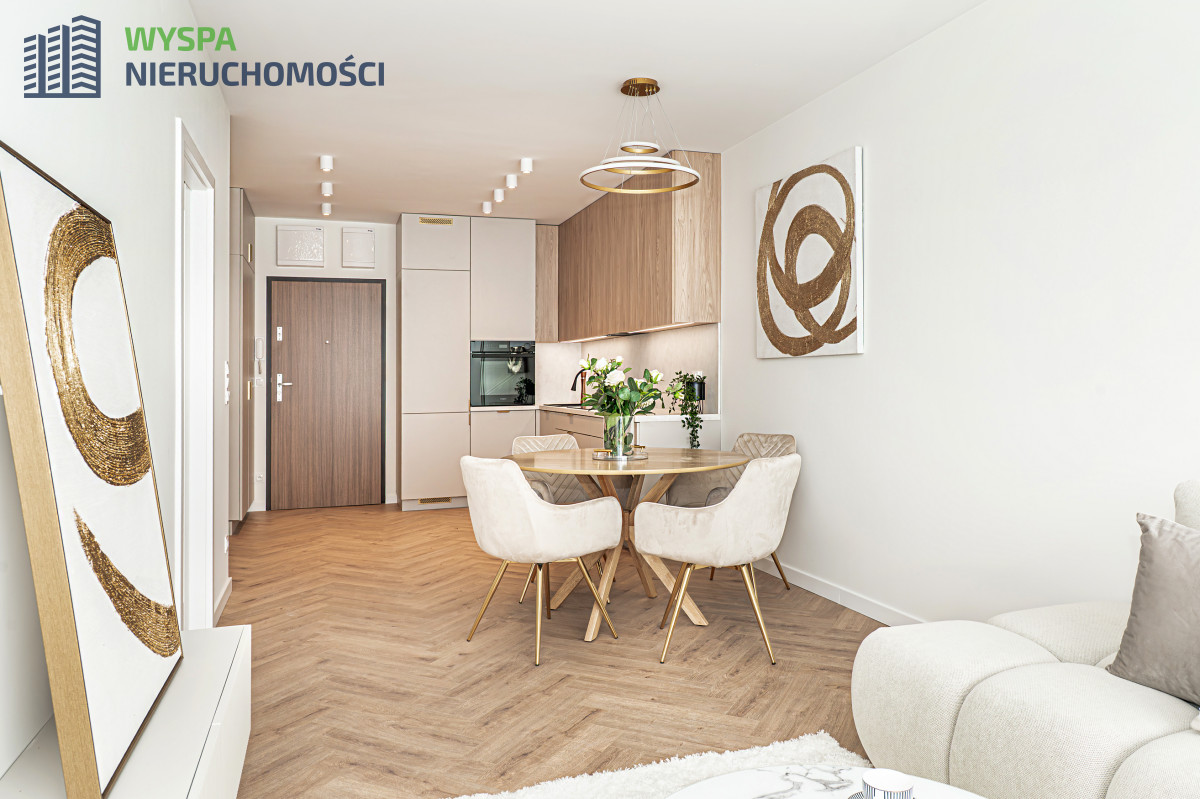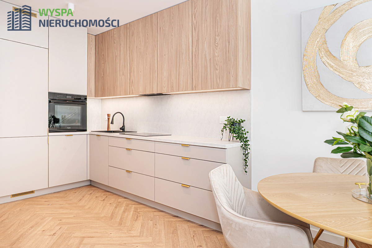W aneksie kuchennym: zabudowa kuchenna: szafki górne z podświetleniem i dolne. Zamontowano sprzęt AGD: piekarnik, płytę indukcyjną, okap, lodówkę i zmywarkę.