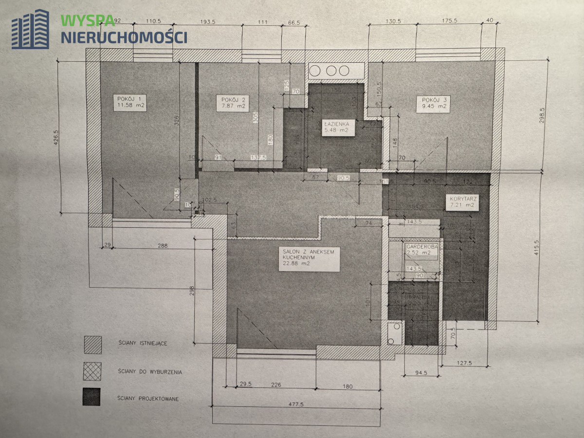 - salon z aneksem kuchennym w kształcie kwadratu, z którego wychodzimy na balkon - 22,88 m2