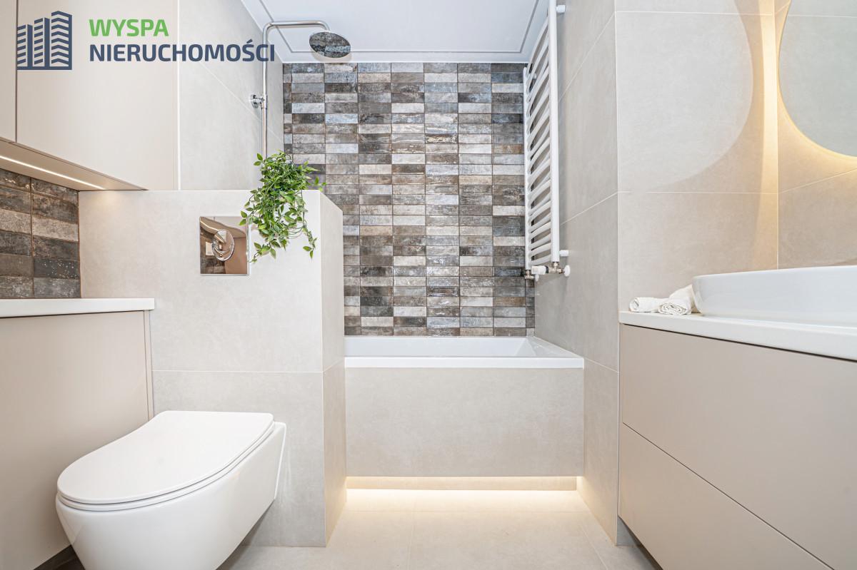 W łazience: WC geberit, umywalka osadzona na blacie, pod umywalką szafka wykonana na wymiar z szufladami, dużo powierzchni do przechowywania akcesoriów łazienkowych, wanna ze szklanym parawanem, z deszczownicą i baterią prysznicową, podświetlane lustro.
