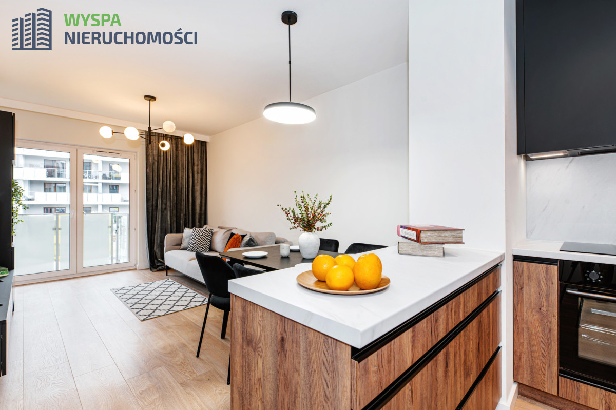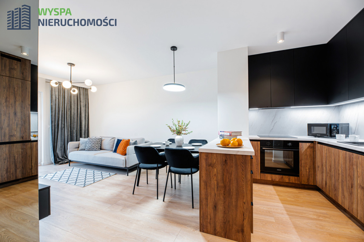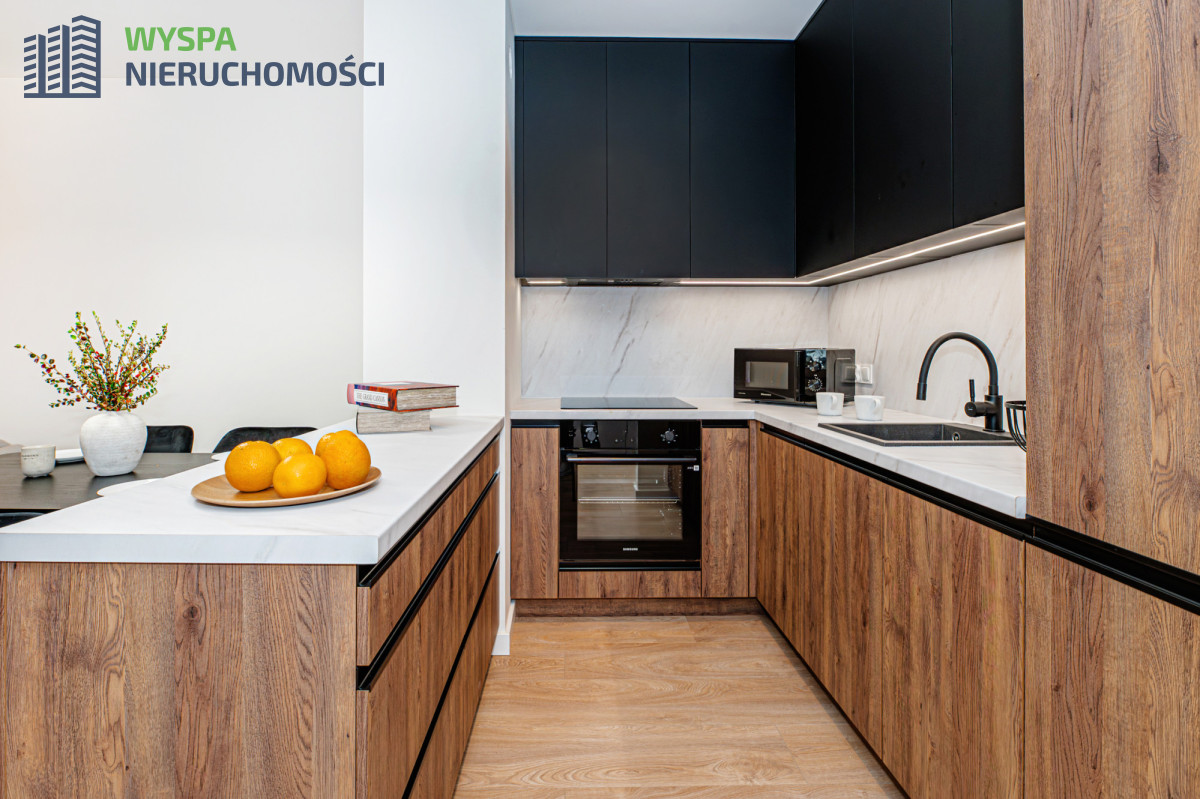 - W aneksie kuchennym: zabudowa kuchenna: szafki górne do samego sufitu, podświetlane i dolne. Sprzęt AGD w zabudowie: okap, płyta indukcyjna, piekarnik. Wyspa z szufladami stanowi dodatkowy blat roboczy i oddziela część kuchenną od części wypoczynkowej.