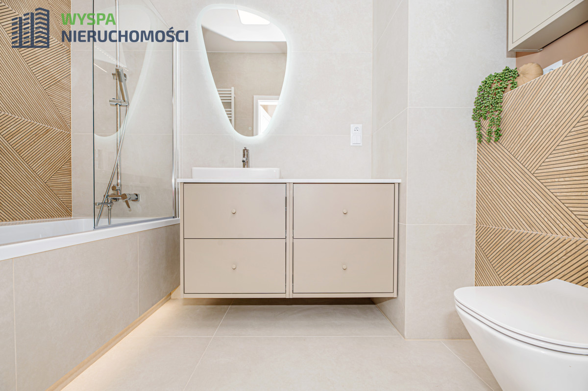 - W łazience - wanna ze szklanym parawanem i deszczownicą, WC geberit z zabudową na akcesoria łazienkowe, umywalka z szafką z dwoma szufladami, eleganckie podświetlane lustro. Zainstalowano oświetlenie dzienne i nocne.