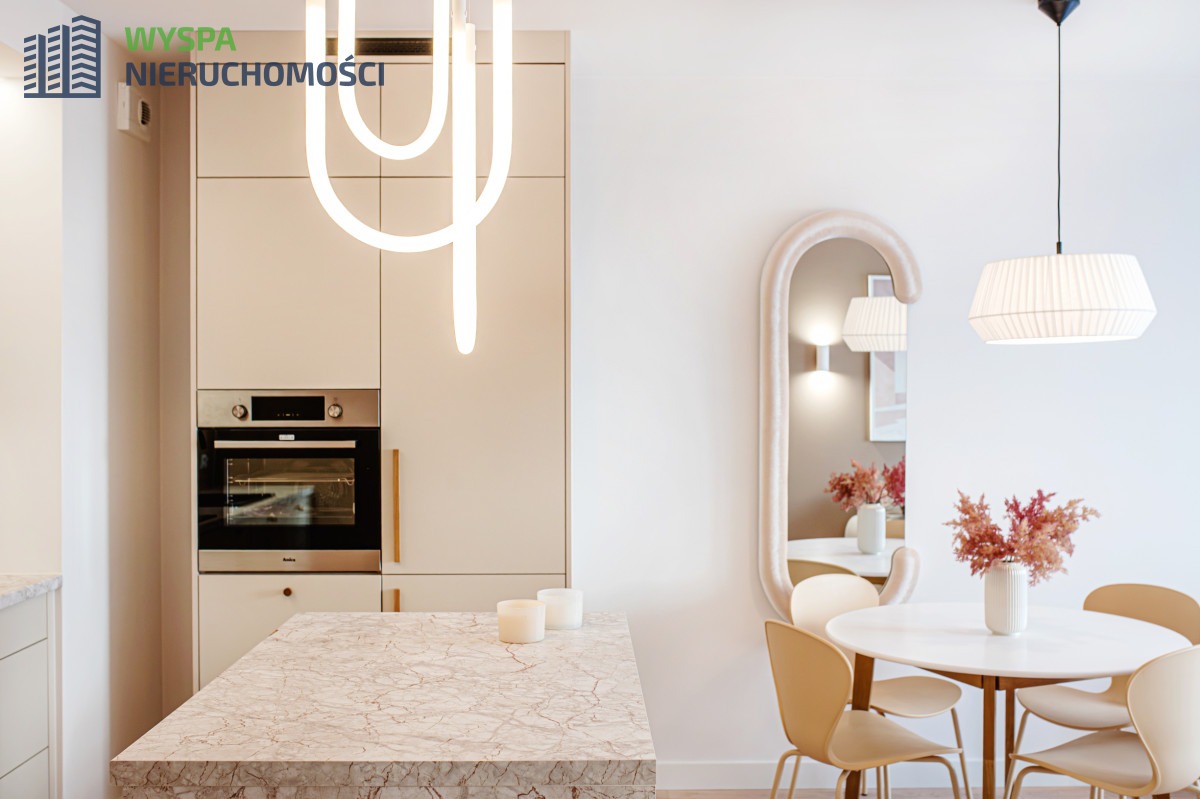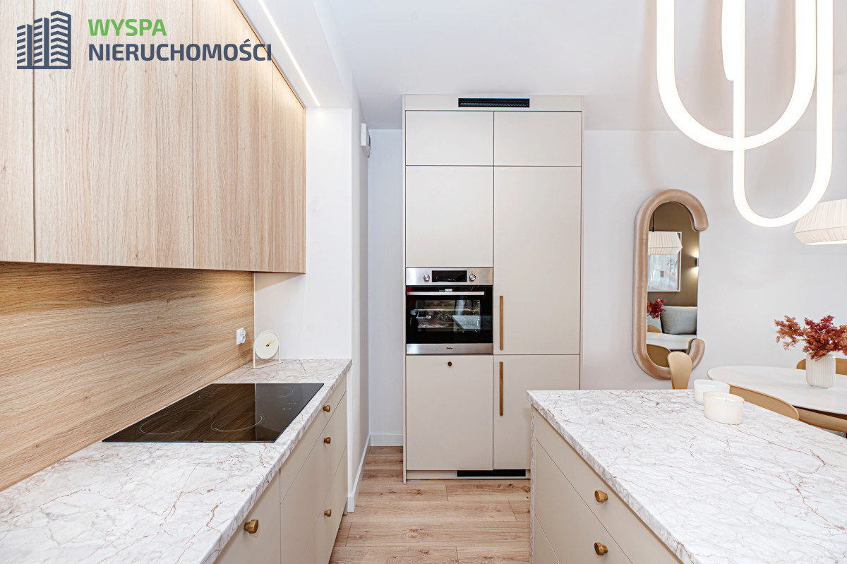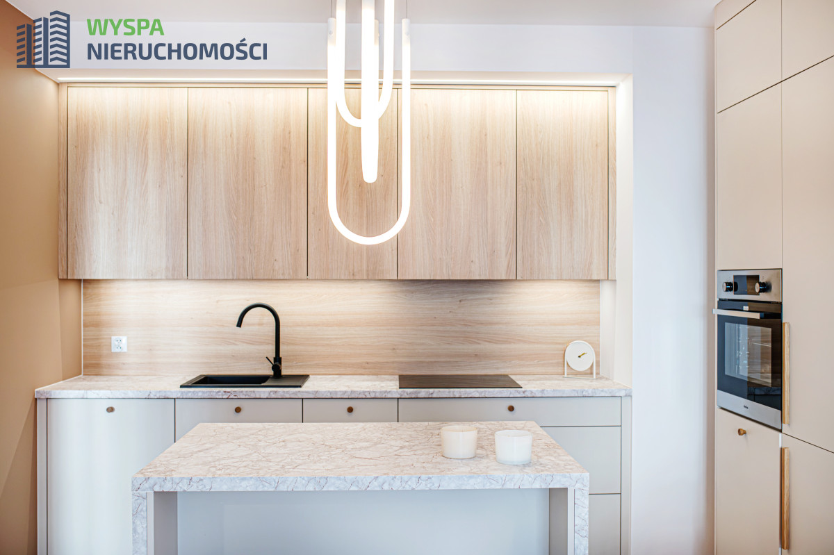 - W aneksie kuchennym: zabudowa kuchenna: szafki górne do samego sufitu, podświetlane i dolne, ze sprzętem AGD: piekarnik, płyta indukcyjna, okap podłączony do komina. Dodatkowo zamontowano wyspę kuchenną z szufladami.