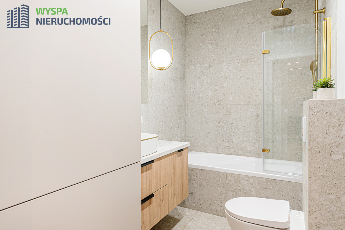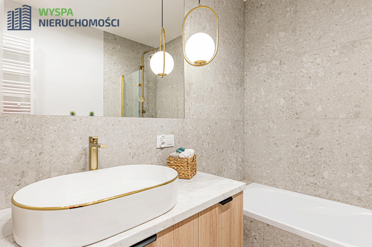- W łazience - na podłodze i ścianach położono wysokogatunkowe płytki, wanna z deszczownicą, baterią prysznicową i szklanym parawanem, WC geberit, umywalka osadzona na szafce z szufladami, zabudowa z miejscem na pralkę i suszarkę. Zainstalowano oświetlenie dzienne i nocne.