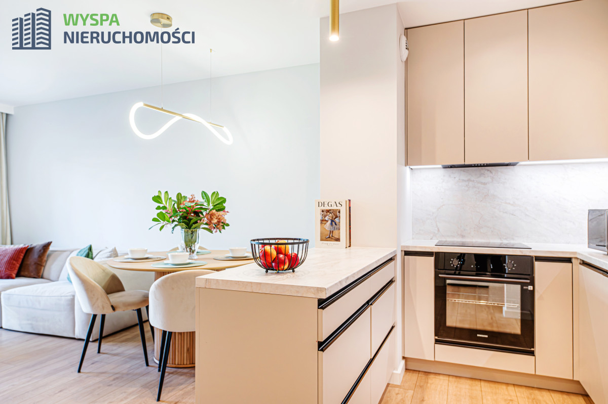- W aneksie kuchennym: zabudowa kuchenna: szafki górne do samego sufitu, podświetlane i dolne. Sprzęt AGD w zabudowie: pochłaniacz, płyta indukcyjna, piekarnik.