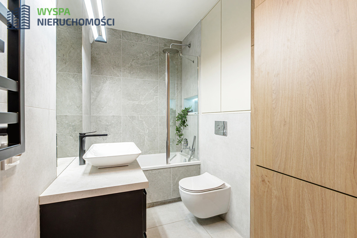 - W łazience - wanna ze szklanym parawanem i deszczownicą, WC geberit z zabudową na akcesoria łazienkowe, umywalka z szafką z dwoma szufladami, eleganckie podświetlane lustro, zabudowa stolarska na pralkę i suszarkę.