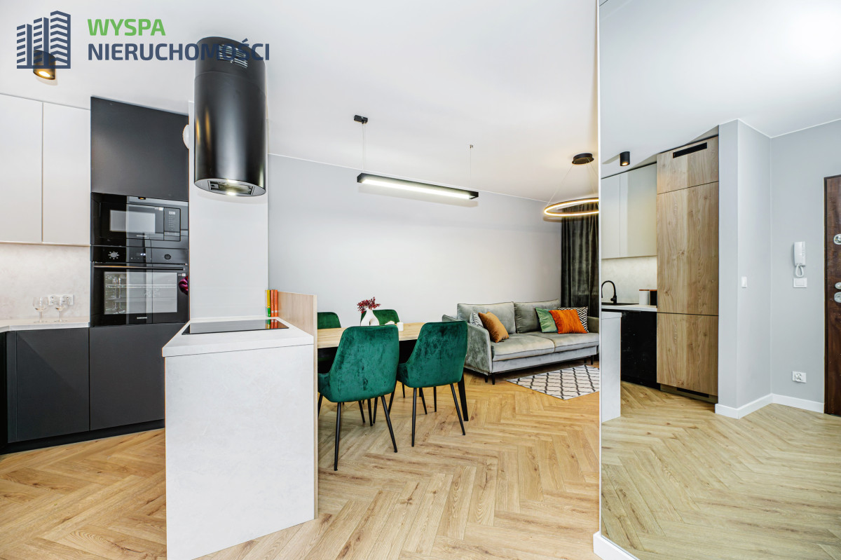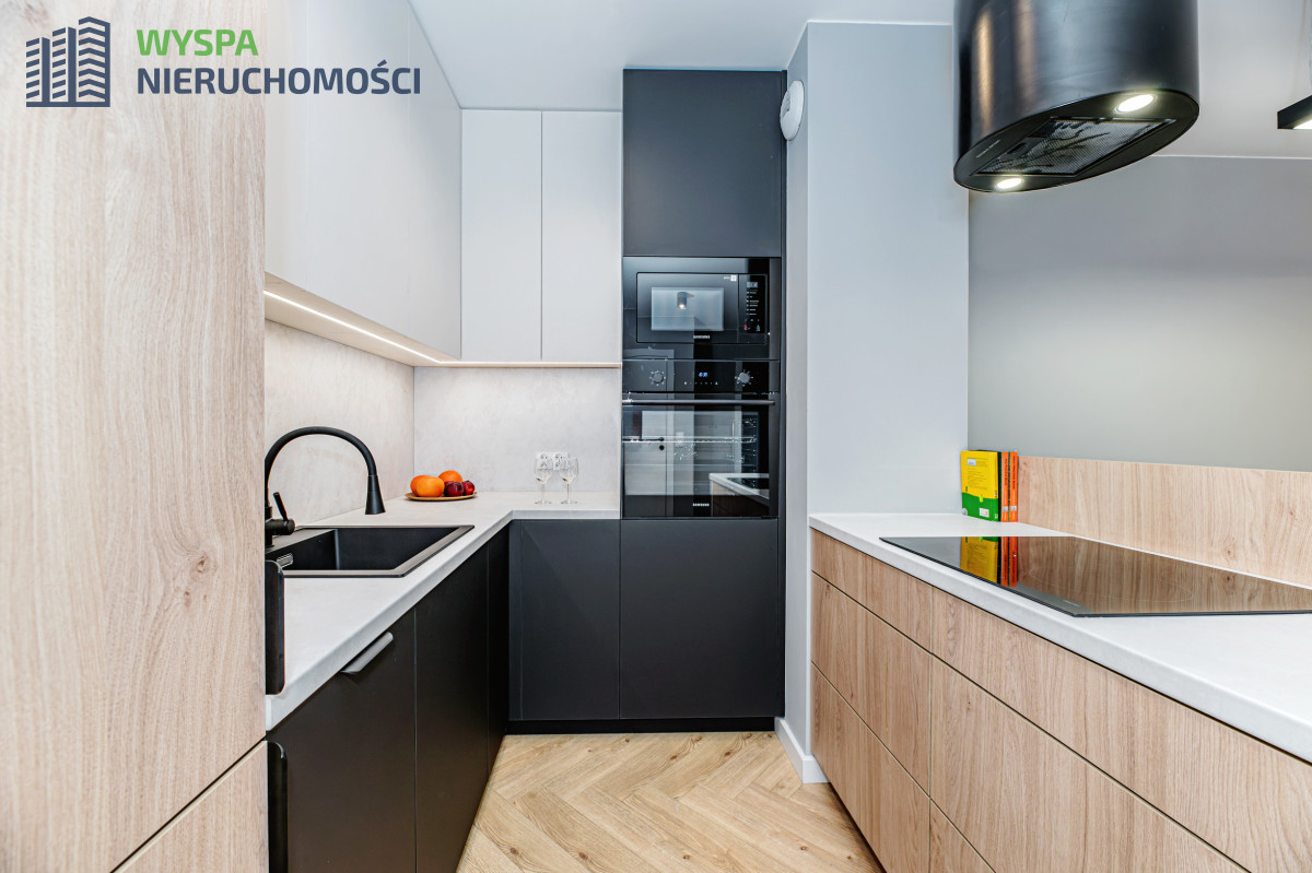 - W aneksie kuchennym: zabudowa kuchenna: szafki górne do samego sufitu, podświetlane i dolne. Dodatkowo zamontowano wyspę kuchenną z płytą indukcyjną i wiszącym nad nią modnym, czarnym pochłaniaczem w formie tuby. Piekarnik oraz kuchenkę mikrofalową marki SAMSUNG zamontowano na wysokości ramion, co powoduje duży komfort i wygodę.