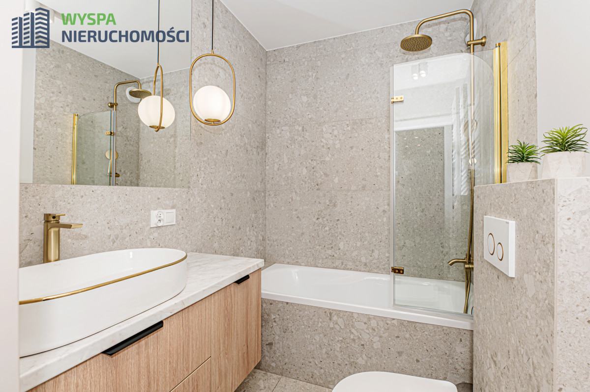 - W łazience -  na podłodze i ścianach położono wysokogatunkowe płytki, wanna z deszczownicą, baterią prysznicową i szklanym parawanem, WC geberit, umywalka osadzona na szafce z szufladami, zabudowa  z miejscem na pralkę i suszarkę. Zainstalowano oświetlenie dzienne i nocne.