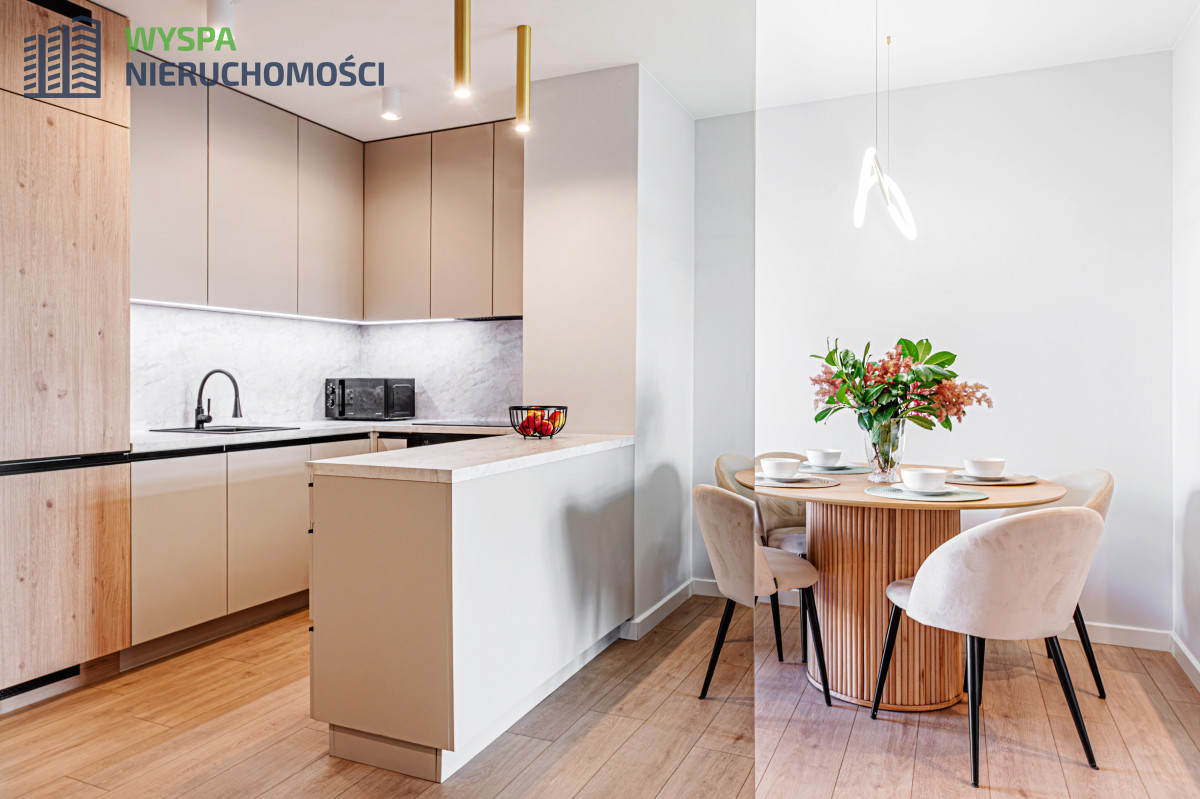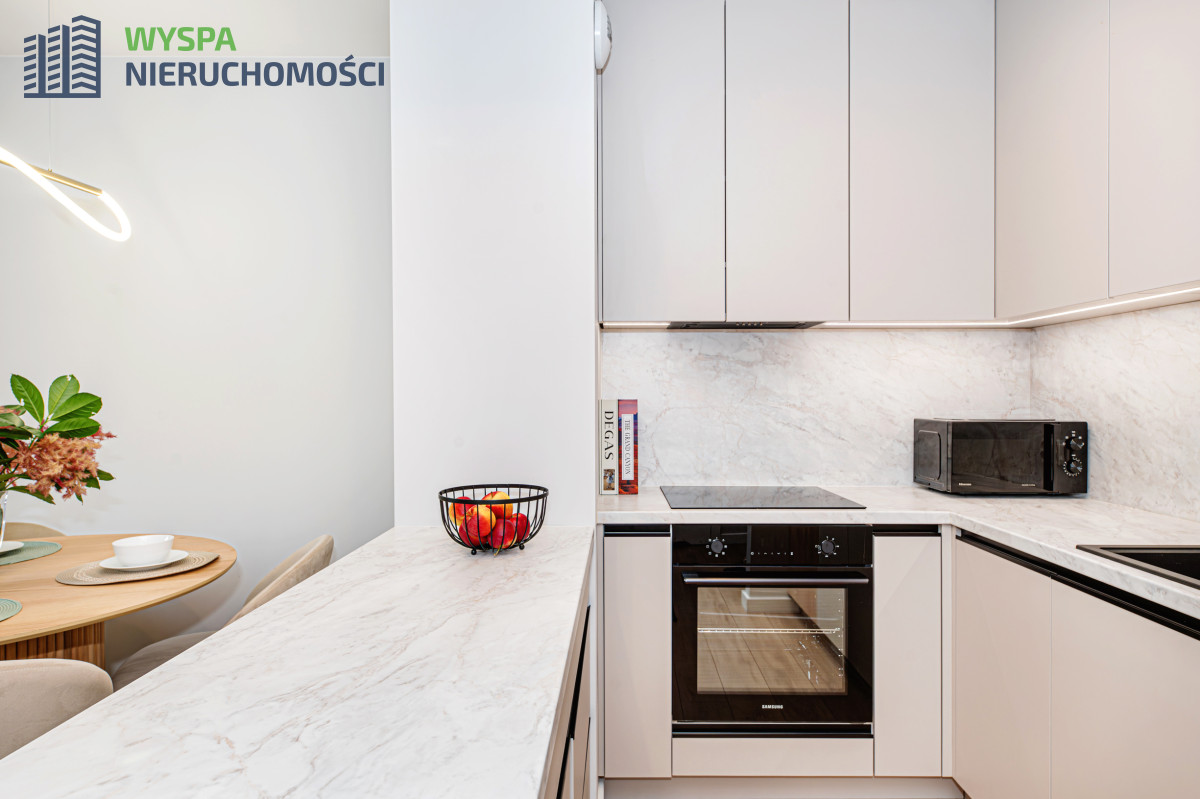 - W aneksie kuchennym: zabudowa kuchenna: szafki górne do samego sufitu, podświetlane i dolne.  Sprzęt AGD w zabudowie: pochłaniacz, płyta indukcyjna, piekarnik.